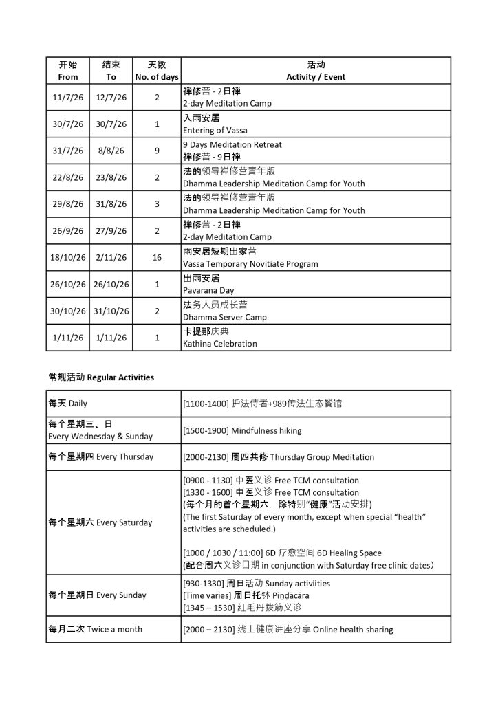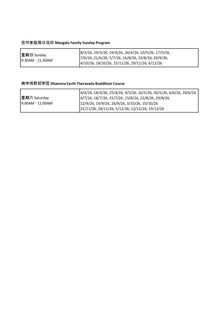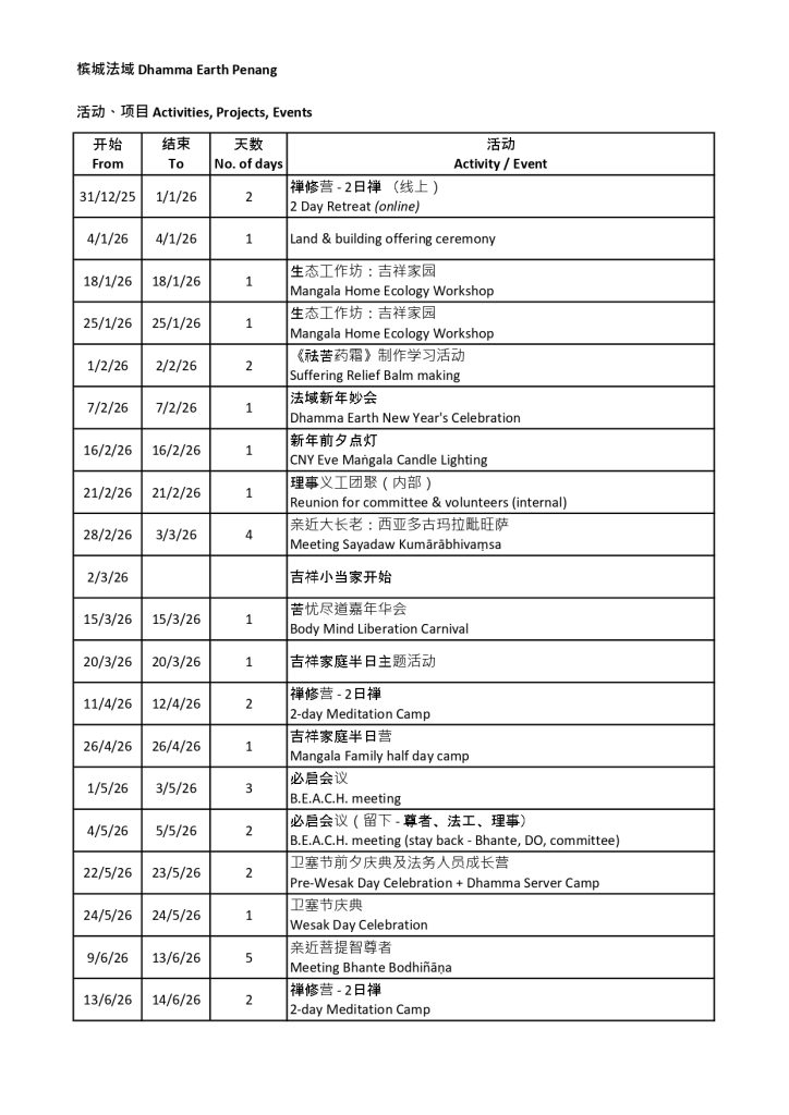 步入2026年,我们很法喜地与大家分享 “槟城法域(Dhamma Earth Penang)2026年度活动安排表”。无论您是想参加禅修营、大型佛教庆典活动,还是参与意义非凡的吉祥家庭活动等等,我们都诚挚欢迎您加入我们的大家庭,共同修习佛法的智慧与慈悲。