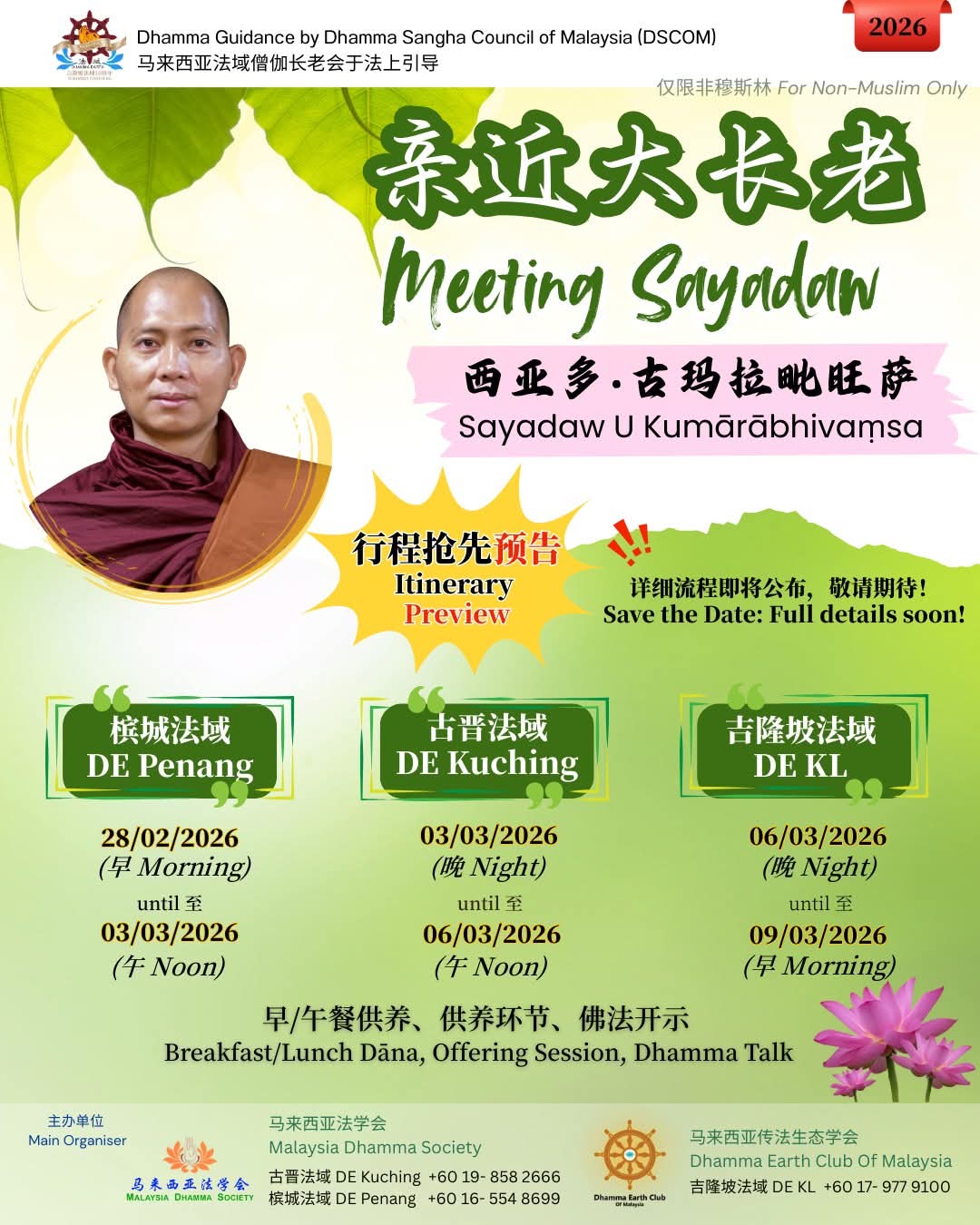 我们荣幸邀请了西亚多古玛拉毗旺萨& 四位比丘前来马来西亚各法域,诚邀大众前来供养、聆听佛法、亲近善知识,共沾法喜