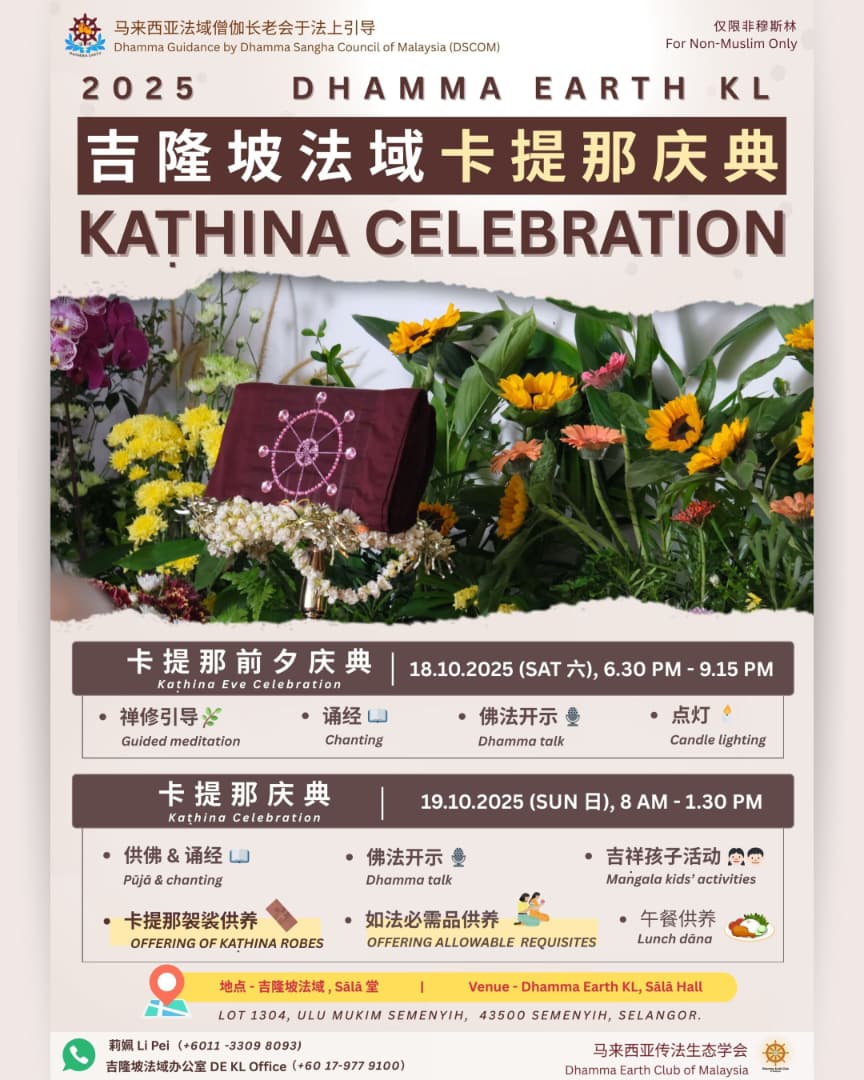 Kaṭhina marks the Saṅgha’s joyful completion of the three-month Rains Retreat (vassa), when devotees offer robes and requisites, rejoicing and generating abundant merits together. All are warmly invited to DE KL to rejoice, support the Triple Gem, and share in boundless merits!