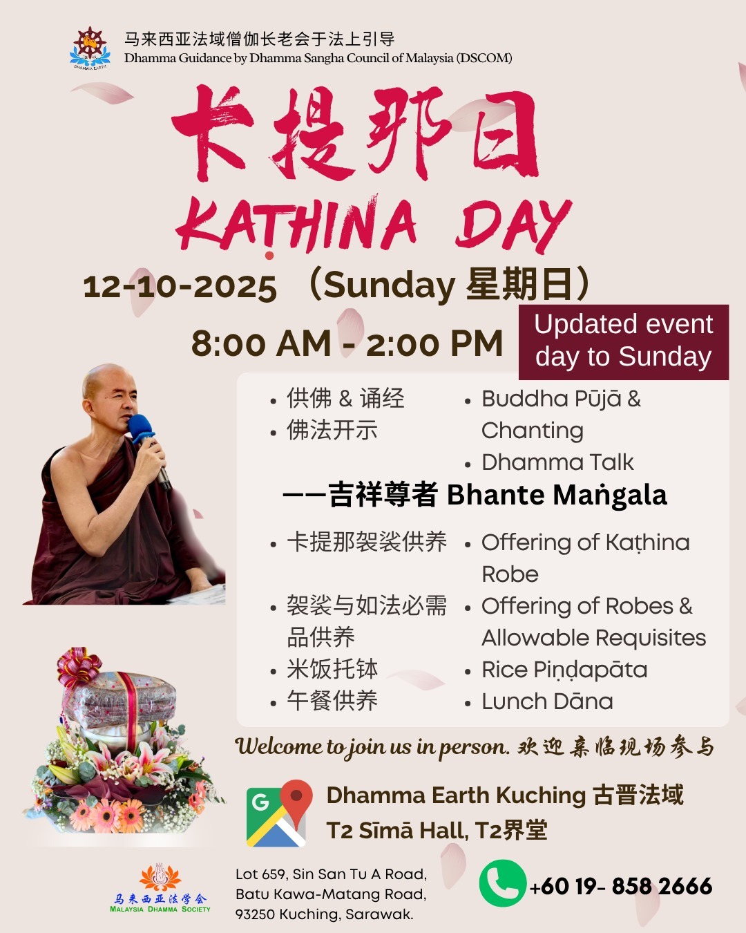 🌷 We are glad to share that Bhante Maṅgala will be leading the Kaṭhina Day event, whereas Bhante Dhammagavesaka will be leading the Kaṭhina Eve event! Remember to mark your calendar~